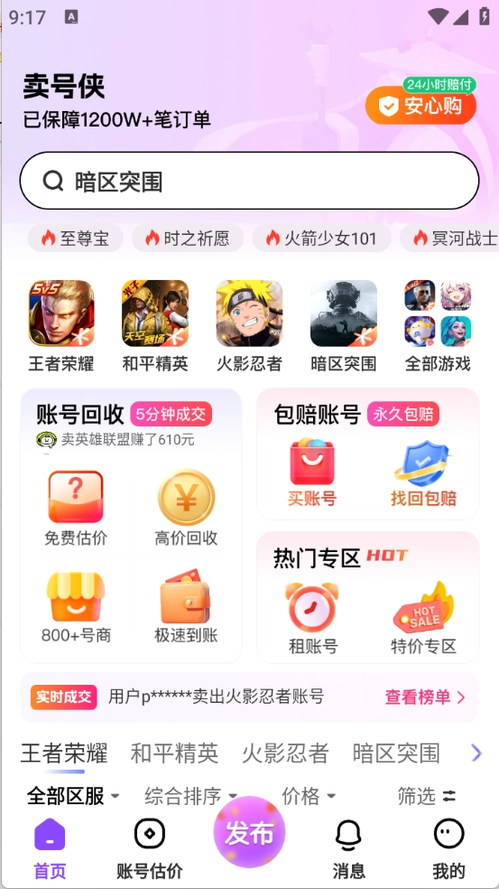 进入首页后,这里汇集了海量的游戏账号类型,其中有王者荣耀、和平精英和火影忍者等热门游戏的账号。