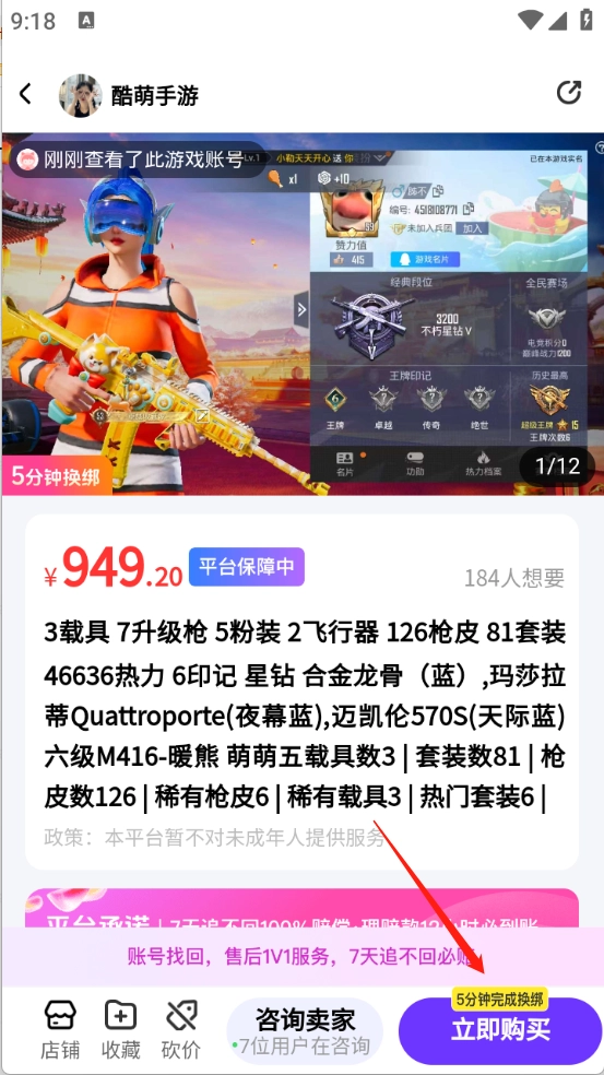 用户点开想要的游戏账号,点击“立即购买”即可。