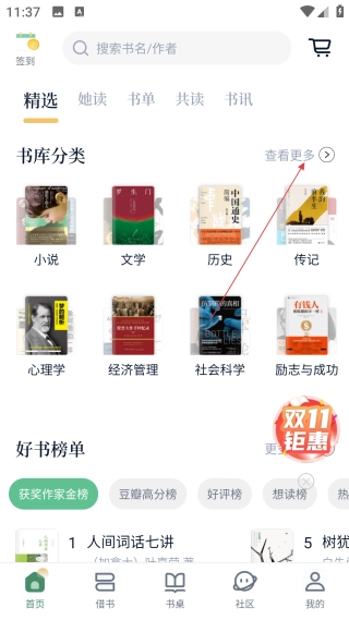 在书库首页,点击【查看更多】按钮,即可进入书库分类的完整列表页面。