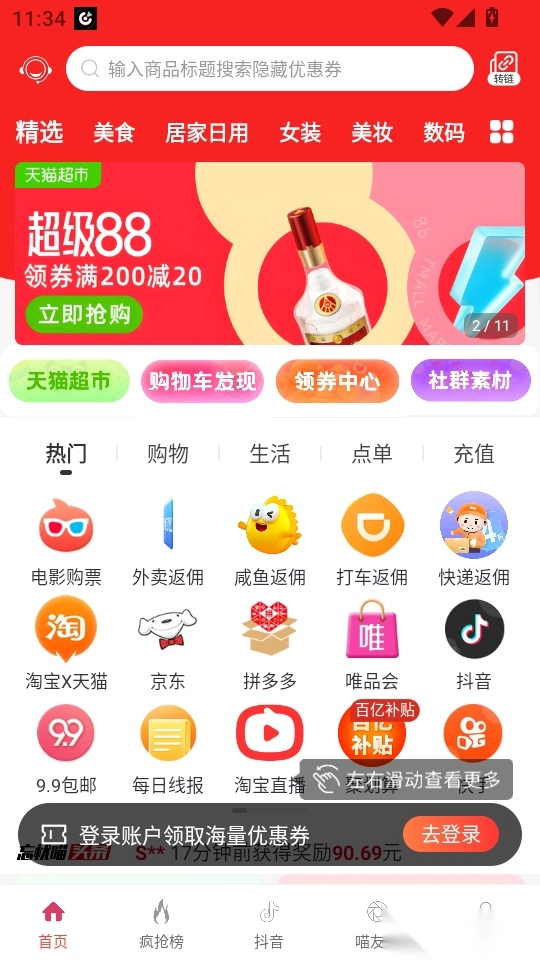 整合淘宝、京东、拼多多等主流购物平台的隐藏优惠券,实现全网购物优惠,用户无需切换多平台,在该软件即可获取多渠道折扣。