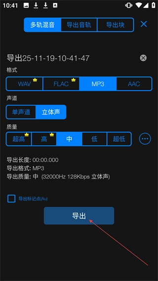 进入导出设置页面,确定好音频格式、声道、质量等各项参数,再点击界面上的【导出】按键。