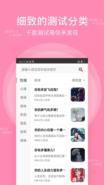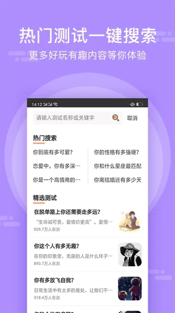 手机端首屈一指的原创趣味测试应用。于微信与微博平台积累的粉丝量超千万。无论是星座测试、性格测试,还是心理测试、爱情测试,亦或是影视同人相关测试,这里统统都有!