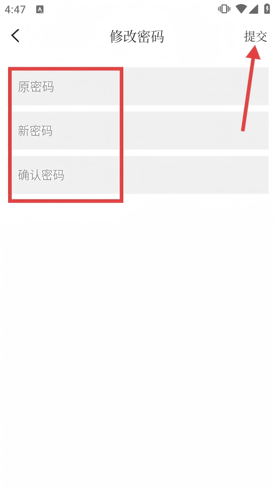 在密码修改页面,按顺序填写【原密码】【新密码】【确认密码】,点击【提交】按钮即可完成密码修改操作。