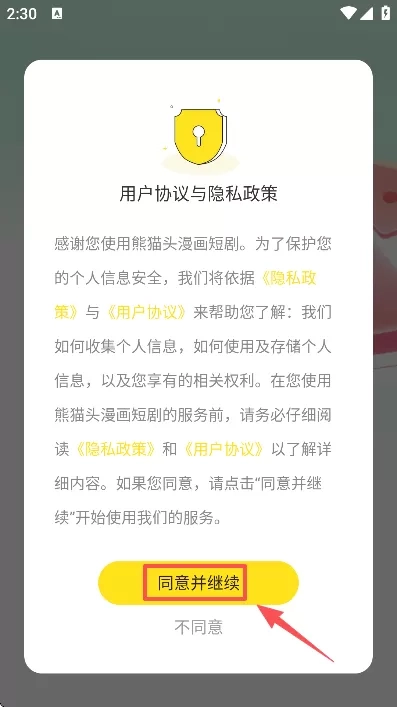 1. 开启软件,阅读用户协议与隐私政策后,点击“同意并继续”。