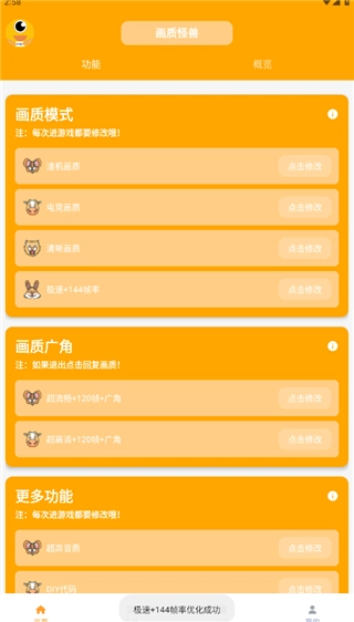 画质怪兽120帧版是一款专注于画质调整的软件,它能对多款热门游戏进行画质修复与优化,适配不同品牌和型号的手机及系统版本,助力用户获得更清晰、更流畅的游戏画面。此外,软件还了多种实用的游戏辅助工具,全方位满足用户的各类使用需求,感兴趣的用户不妨一试。