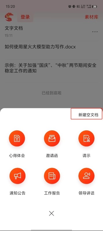 点击首页右下角的“+”按钮,就能进入文稿写作功能页面。在这里,您既可以直接创建新的空白文档开始编辑,也可以借助我们的AI辅助撰稿功能来完成写作。