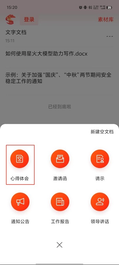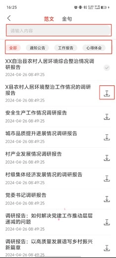 在范文生成板块,当前共涵盖六种文稿类型,具体有心得体会、邀请函、请示、通知公告、工作报告以及领导讲话。