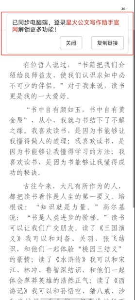 当您第一次保存某类文体的文档时,系统会提示该文档已同步至电脑端,此时点击“复制链接”按钮,就能把讯飞文书网页端的网址复制到剪贴板中。