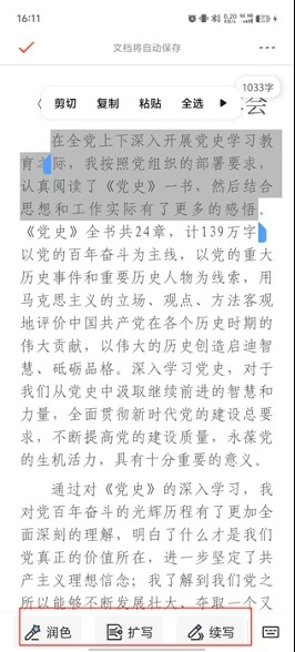 若您有需要修改的内容,只需先选中待处理的部分,再在界面下方选择润色、扩写或续写功能即可。