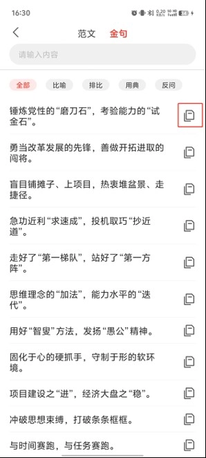 除了范文,我们还准备了各类金句供您参考。如果您对某句金句感兴趣,只需点击金句右侧的复制按钮,就能将其复制到剪贴板。