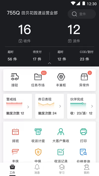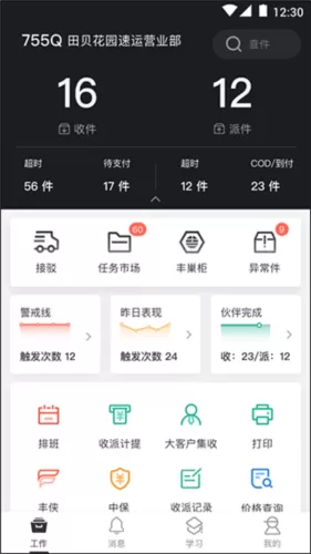 3、通过工作数据统计查看:App主页会统计每日工作数据,包括派件数、收件数等,结合运费标准可估算当日收入,同时能查看异常件、待支付运费包裹等影响收入的特殊情况。