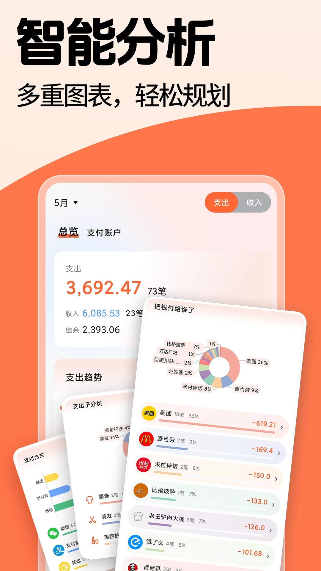 借助简单记账的分析功能,您能轻松查看各个维度的收支情况。买了啥?买了几回?银行卡支出多少?一目了然!