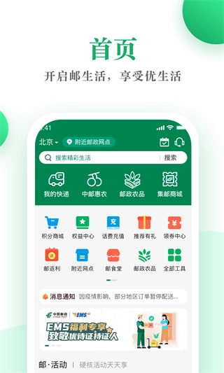 邮生活是中国邮政推出的会员权益服务平台,秉持“开启邮生活,享受优生活”的核心理念,整合邮政全产业链资源,涵盖邮政业务办理、生活服务缴费、线上购物消费、会员权益兑换等丰富场景,借助线上线下联动模式,为用户提供便捷、实惠、安全的一站式智慧生活服务方案,助力邮政服务实现数字化与生活化的深度融合。