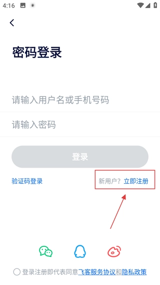 在登录/注册页面,点击立即注册,进入注册页面。