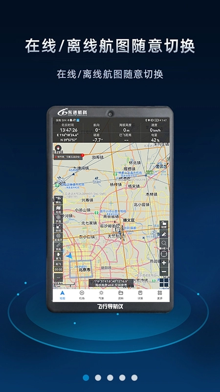 打开软件后,映入眼帘的首页是一张十分详尽的地图,这张地图支持各类精细化操作。下方的菜单栏里,还能找到附近的机场地址、天气状况等信息。值得一提的是,地图已提前准备妥当,即便处于离线状态也能正常使用。