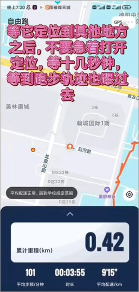 等它定位到别的地方后,先别急着开启定位,稍等十几秒,等跑步轨迹显示出来了再跟过去