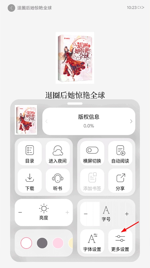 进入应用后选择一本书籍打开,点击页面空白处会弹出菜单,从中选择“更多设置”选项即可。