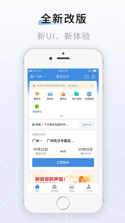联友出行是一款优质的共享汽车出行软件,当前在广州开展运营。它为用户提供了按分钟里程计费、自主取还车辆、步行5分钟即可取车、自助完成缴费等多种功能。使用联友出行的共享汽车,能让用户的出行更加便捷,有需求的朋友们快来体验吧~~~