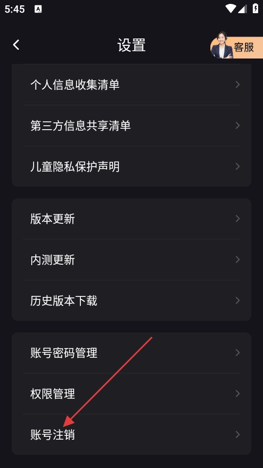 进入设置界面后,找到并点击【账号注销】选项,即可跳转至账号注销确认界面。