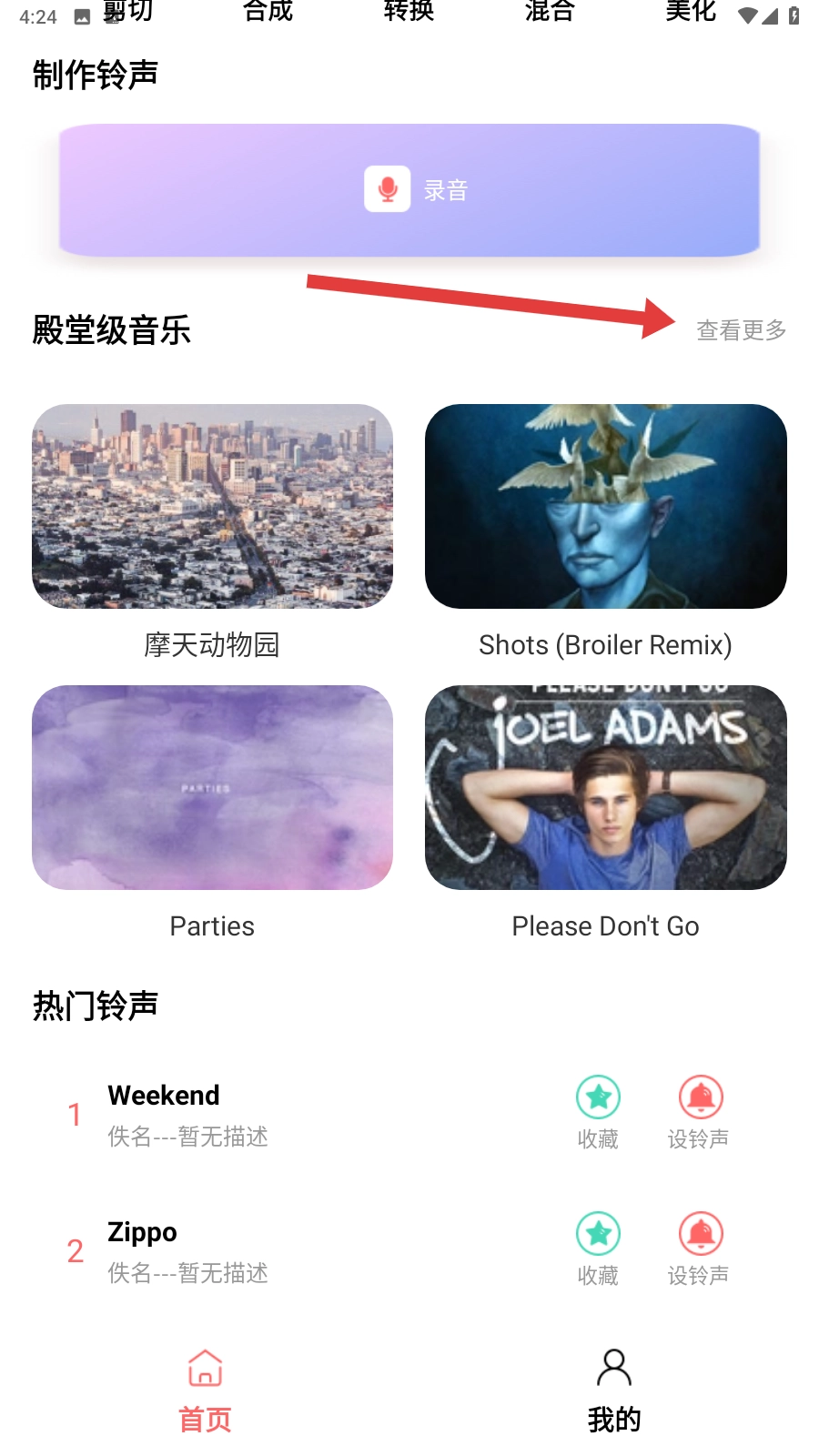 打开【手机铃声制作】软件后,进入【殿堂级音乐】板块并点击【查看更多】,即可浏览到种类丰富的音乐列表。