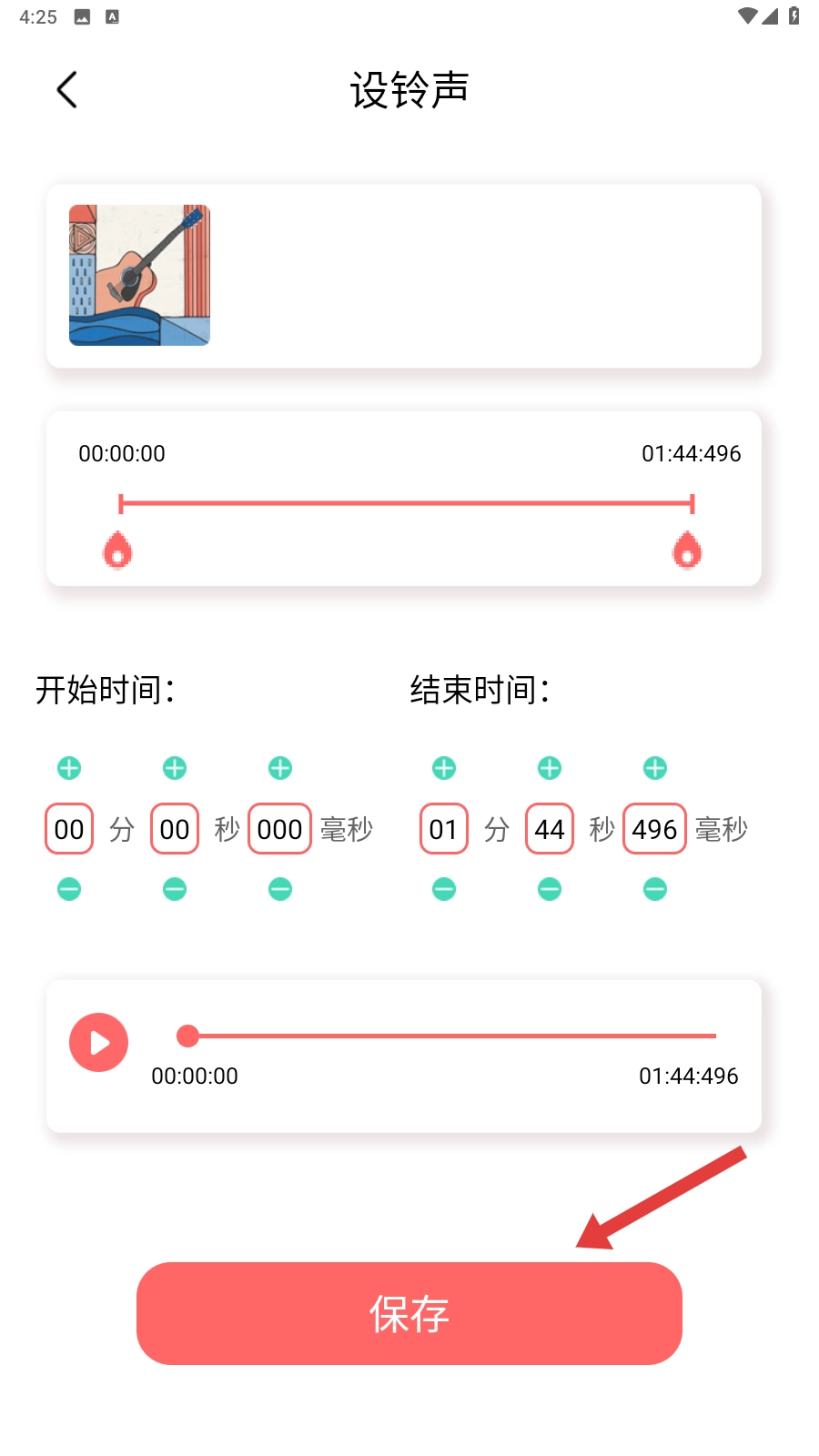 在铃声设置界面,先调整好铃声的起始和结束时间,再点击【保存】按钮,这样就可以完成铃声的设置了。