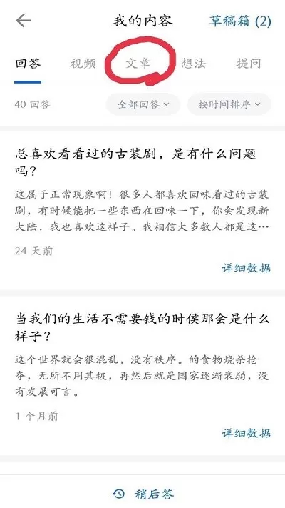 2、点击创作选项进入创作中心页面,点击我的内容,然后选择点击的文章按钮。