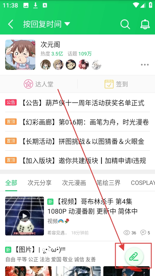 进入【次元阁】板块后,点击右下角那个绿色的编辑按钮,就可以开始准备发布新话题了。