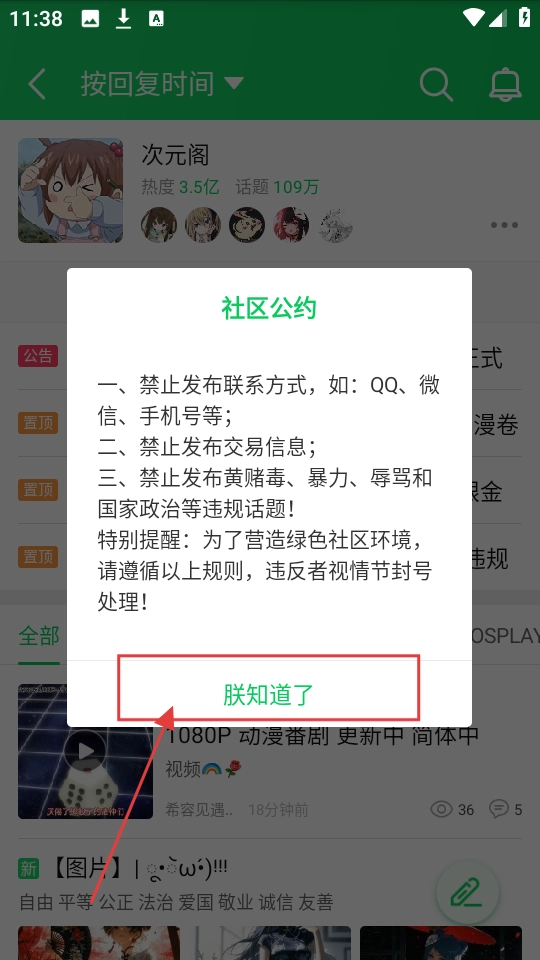 在发布话题之前,系统会弹出【社区公约】的提示窗口。等你阅读完公约内容后,只需点击【朕知道了】这个按钮,就可以接着进行后续的操作啦。