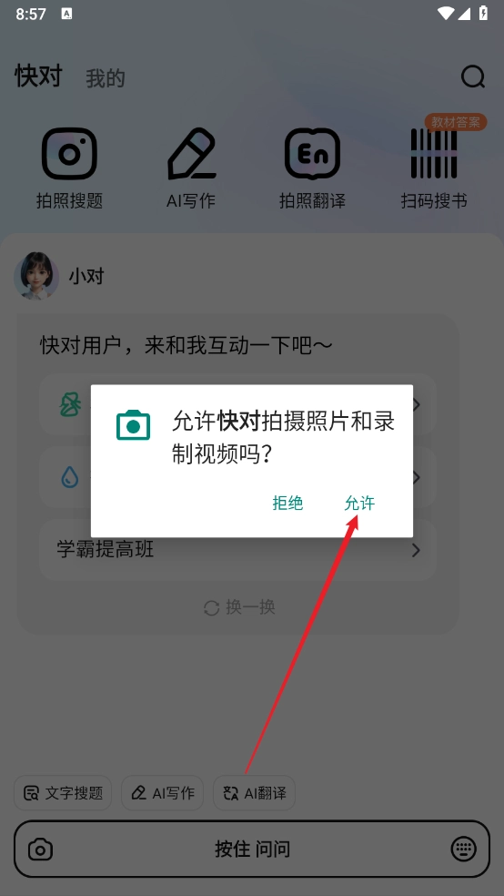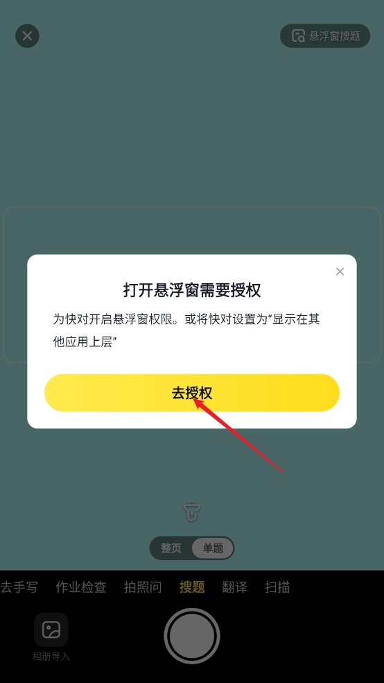 打开软件后,进入拍照搜题界面,找到并点击右上角的“悬浮窗搜题”按钮。