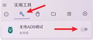 如图所示,点击工具图标后,打开“无线ADB调试”的开关即可。