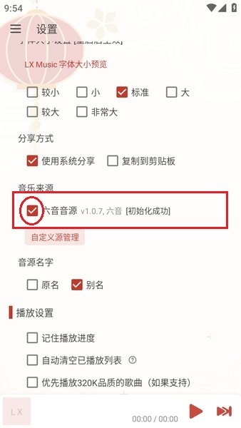 然后勾选“六音音源”,像图中显示的那样,系统会提示“初始化成功”。