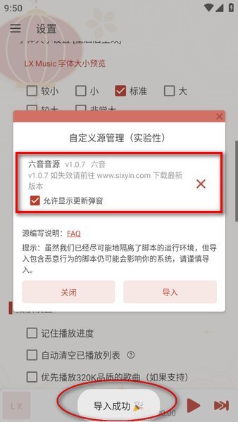 操作后会显示“导入成功”的提示,就像图里展示的那样,界面上会出现一个“六音音源”,接着点击“关闭”按钮即可。