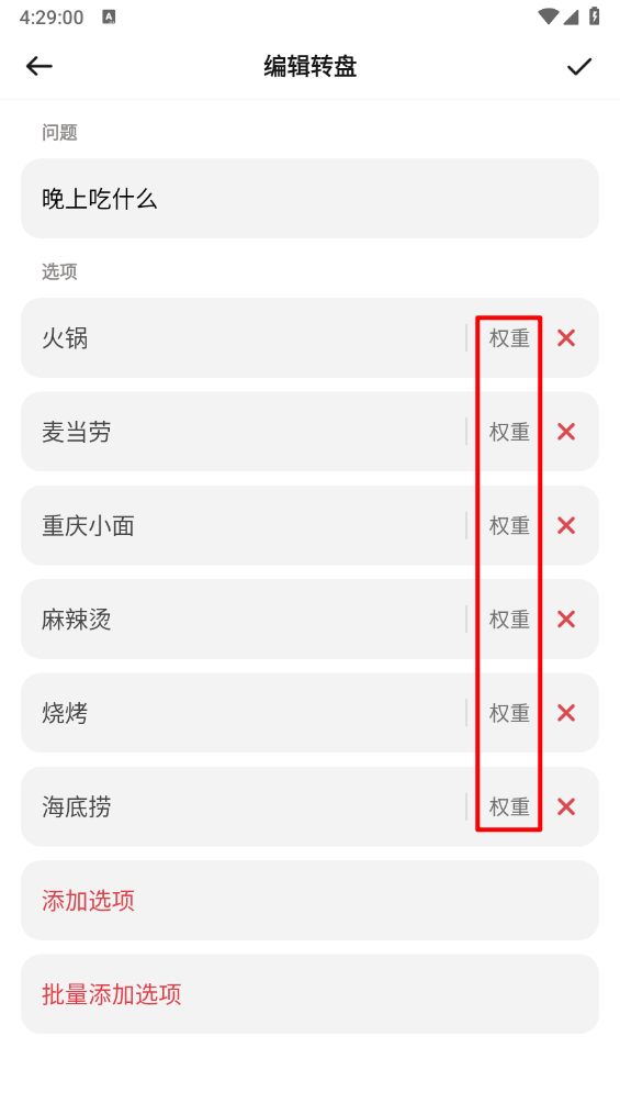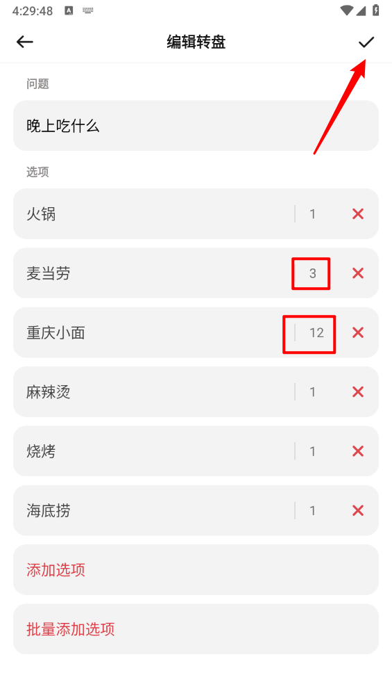 如图,可依据个人需求设置对应的转盘概率,点击右上角的“对钩”即可完成操作。