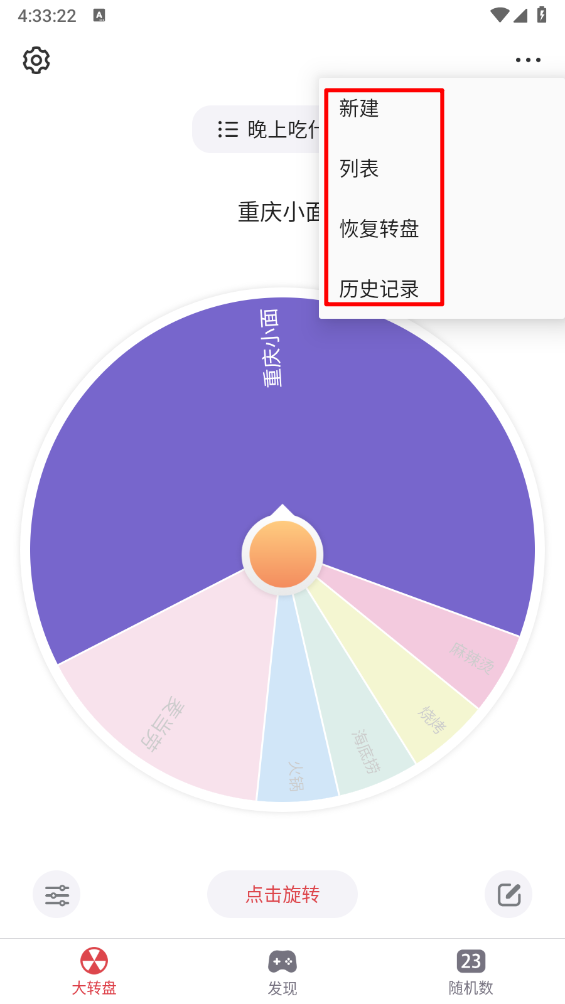 然后点击右上角的三个点,就能进行新建选项、恢复转盘、新建转盘列表等操作。