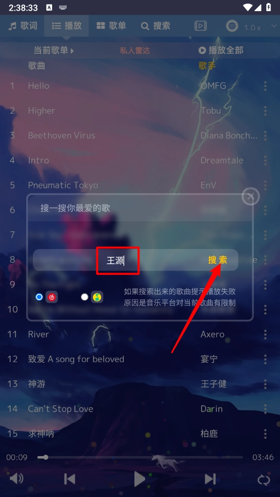 支持搜索歌手、歌名、专辑,如图所示。