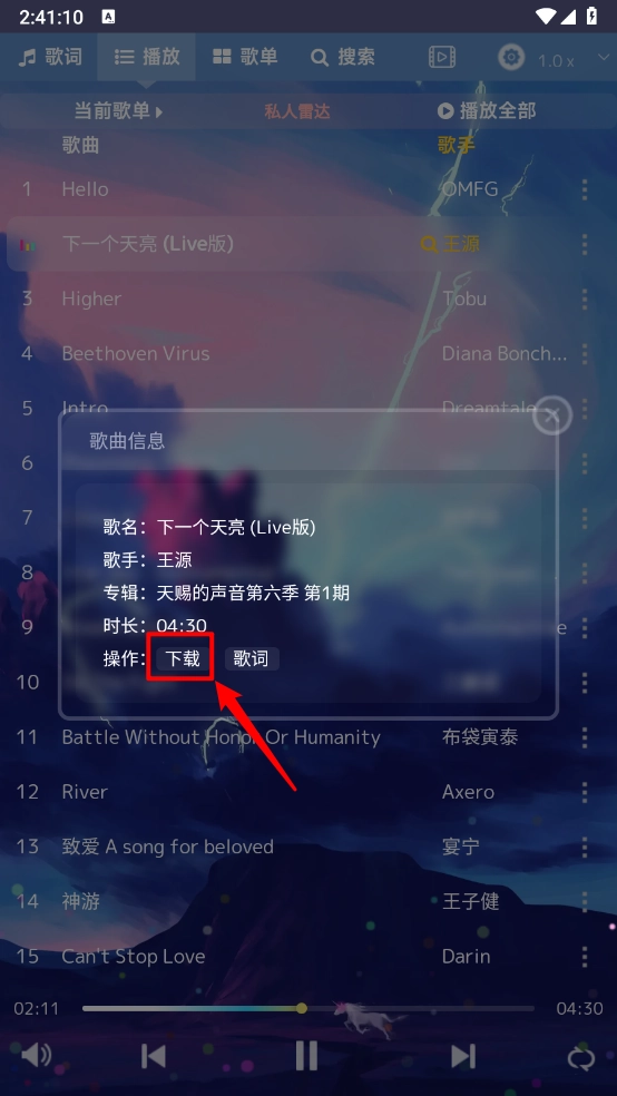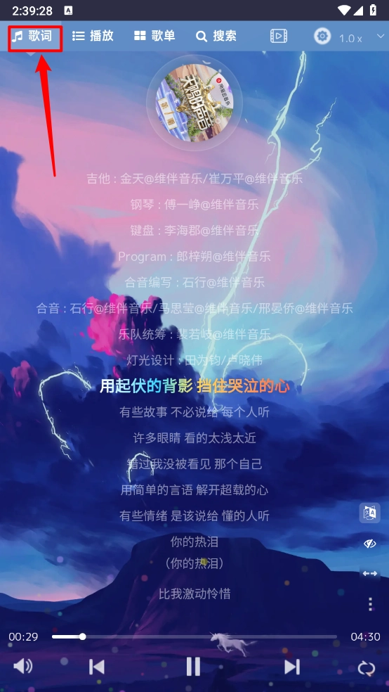 切换到歌词页面就能查看歌词,点击右下角的按钮可以切换播放模式。
