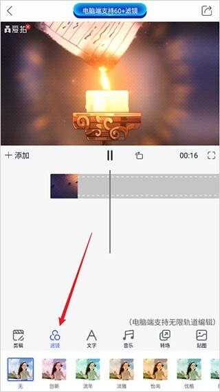 点击【滤镜】,可以给视频添加滤镜效果;