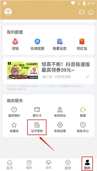 爱用商城,在我的界面中,点击下方的证件更新选择
