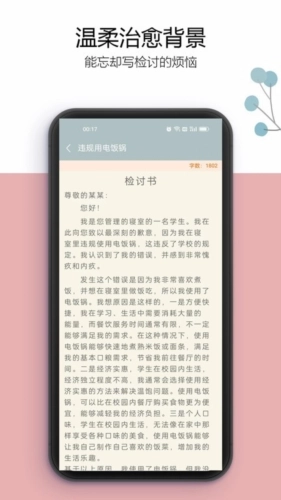 万能检讨书的用户界面设计得很舒缓,风格清新,不会给人压抑感。用它写检讨的时候,感觉跟写日记似的轻松自然。这款通用的自我批评软件还了许多实用的模板,能满足不同场景的需求。
