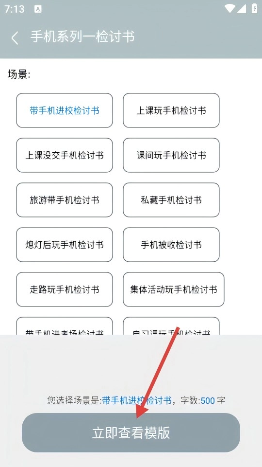 选择【带手机进校检讨书】这个场景,点击【立即查看模板】,就能获取对应的500字范文内容。