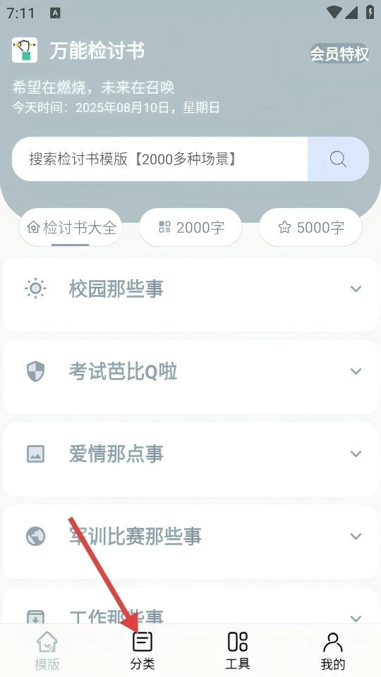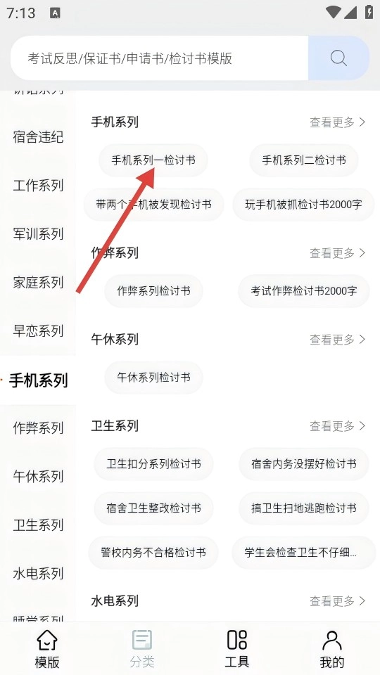 在模板页点击【分类】选项,进入分类导航界面后,查找【手机系列—检讨书】这类细分的类型。