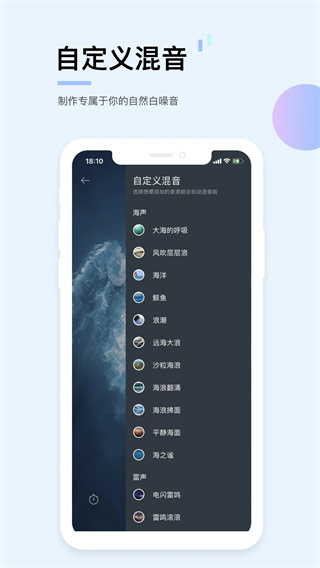 软件包含海浪声、雷声、流水声、虫鸣鸟叫等近百种自然场景音效。