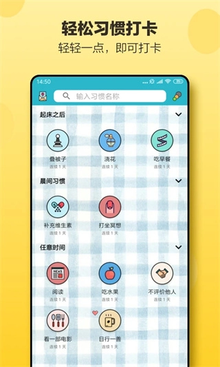 非常丰富的习惯模板,提供睡前刷牙、背单词、休息一下及醒来喝水等模板。
