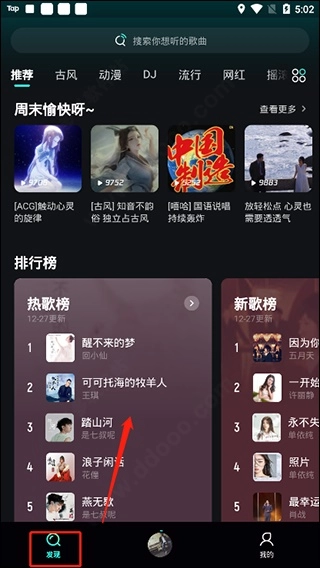 点击左下角的星球图标就能进入发现页面,这里有各类歌曲可供播放,你也可以点击顶部的搜索框,查找自己想听的歌曲。