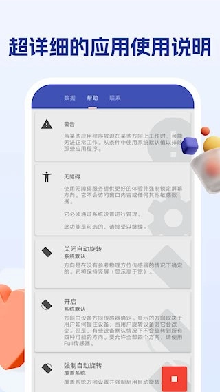 屏幕方向管理助手具备全局强制旋转功能,能够打破系统限制,锁定任意显示方向。该助手包含横屏、竖屏以及反向显示模式,适用于视频观看、阅读等特定场景下的显示需求。