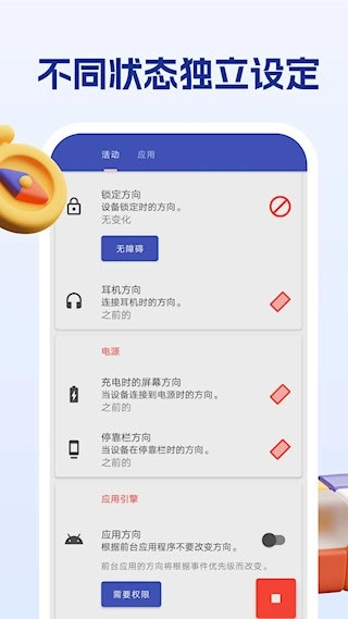 屏幕方向管理助手是一款聚焦移动设备显示方向调控的工具,能打破系统默认的旋转约束。它提供强制横屏、竖屏、反向显示等多种定向模式,还可针对特定应用单独配置显示方向,让屏幕显示管理更具灵活性。该工具支持在来电、充电、连接耳机等特殊状态下自动切换屏幕方向。用户可以根据自身使用习惯,预先设置不同场景的显示方案,比如充电时保持横屏、接听电话时切换竖屏等,从而实现智能化的情景适配。