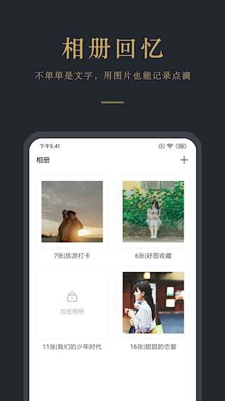 「隐私守护」- 支持手势密码与生物识别解锁功能,为日记和云端相册提供加密存储保护