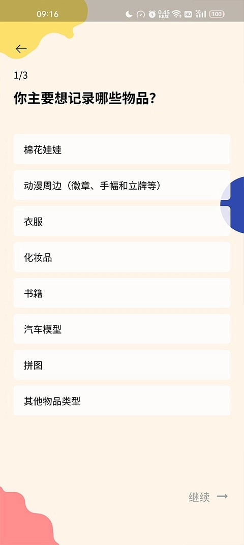 登录软件后,挑选你主要想记录的物品,选好后点击继续。