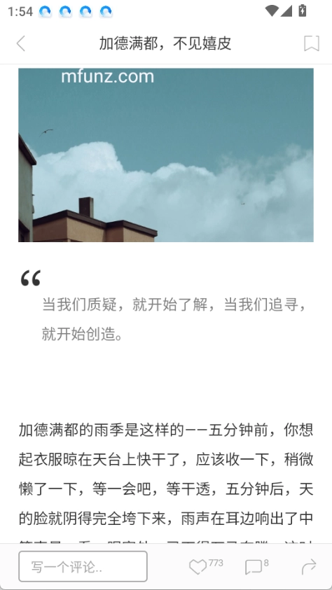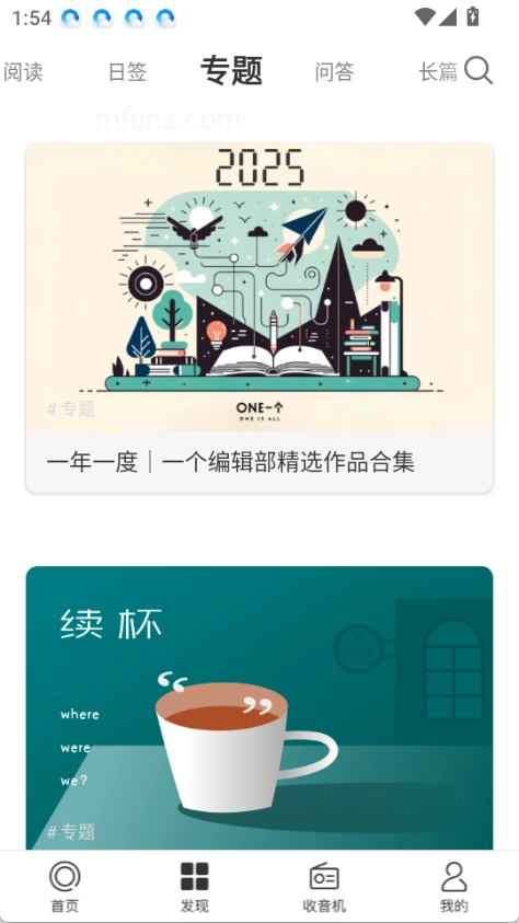 1也就是大家都熟悉的那个,这是一款特别受年轻人青睐的手机阅读应用,无论是界面设计还是其他方面都带有文艺气息,它最突出的特点是每天仅推送一篇内容。和其他同类阅读软件相比,它更能契合用户的心理需求——如今碎片化时间十分宝贵,过多的文章用户未必能坚持读完,而1每天一篇的推送节奏,能让用户阅读时感觉更轻松无压力。