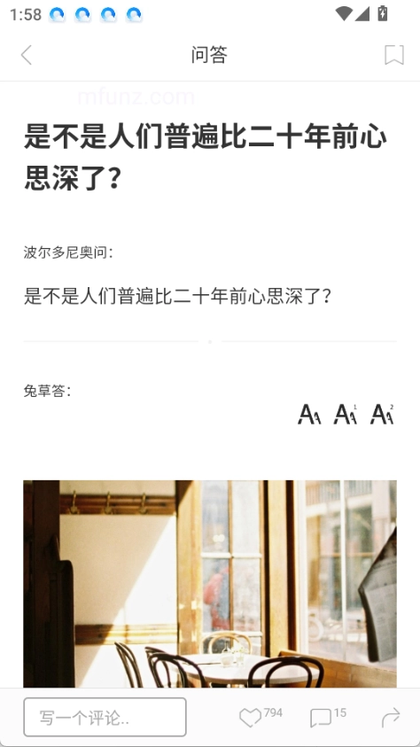 打开应用后,在首页通过上下滑动的方式,就能浏览广场里的各类文章与话题。平台每天都会精心挑选出一张图画、一篇文章、一个问题以及一条推荐内容呈现给用户。